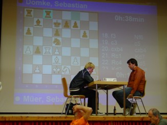jeweilige Spitzenbrett auf der Bühne ausgetragen und die Partie elektronisch
