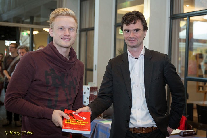 einen Buchpreis von Loek van Wely entgegen.