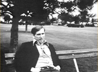 vor dem Zelt, um Fischers berühmtes Parkbankinterview nachzustellen: